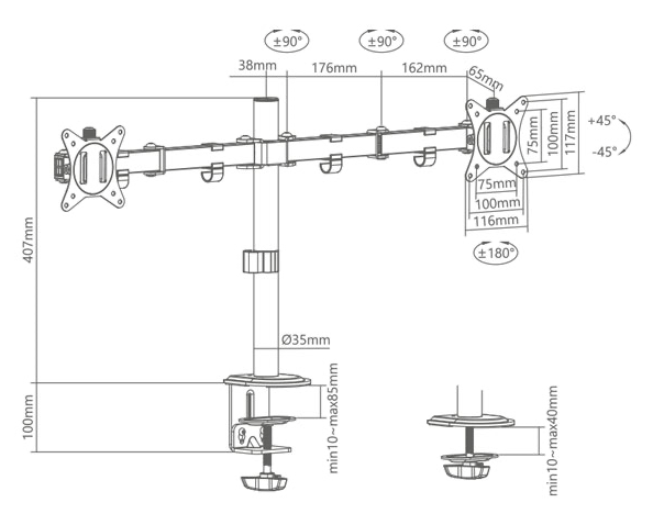 Letvægts Superior monitor beslag, 2 skærme. Passer til skærme fra 17"-32".